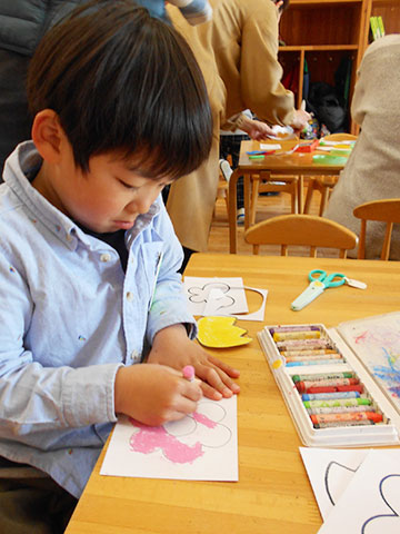 いちょうさんは、ぬりえ。自分の好きな色を丁寧にぬっています。