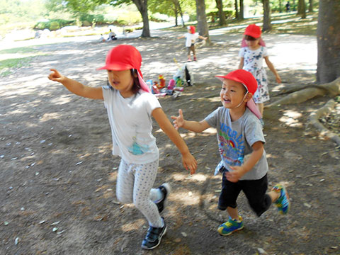 広い芝生広場では、思う存分走って、気持ちのよいこと! 体中を動かして遊んでいました。