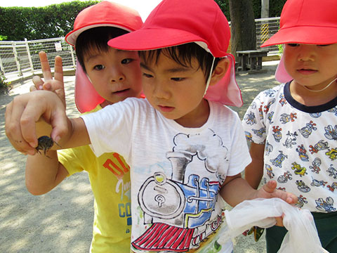 すると、みんなが歩くところに、セミを発見。踏まれないようにと、そーっと、木へ戻してあげていました。