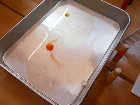絵の具をぽとんとたらし、ちょっとかき混ぜます。