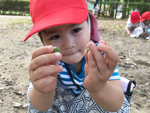 リレー後は、みんなでどんぐり拾い。「みてみて、このどんぐり大きい!」「これ、赤ちゃんみたい!」「帽子かぶっているよ!」とたくさんのどんぐりを発見!