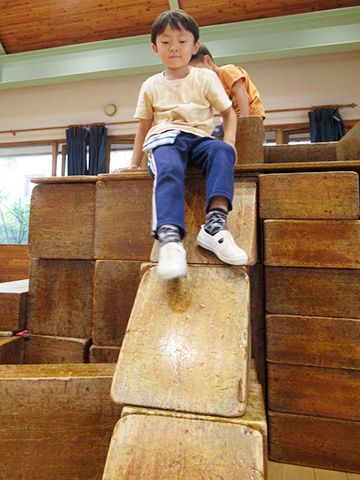 ホールにある大型積み木を使ってお家作り。お友だちと協力しながら積み木を積んでいきます。