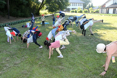 体操係さんの登場。朝、いっぱい体を伸ばそうと考えてくれた体操のスタートです。