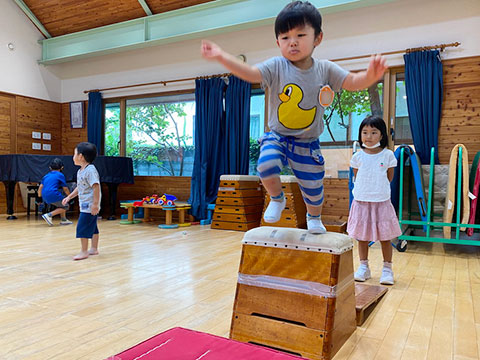 年少・年中・年長のお兄さんお姉さんの遊ぶ様子をよく見ています。「おもしろそう」「やってみたい」と心が動いて、運動遊びに挑戦するふたばさん。お兄さん、お姉さんたちも温かく仲間にいれてくれます。