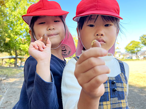 柿や畑の大きな大根、ねぎ(年長児は自分たちも松本一本ねぎを育てているので、「これは松本一本ねぎだ!」と小さいお友だちに教えていました)など、秋の恵みを見つけました。