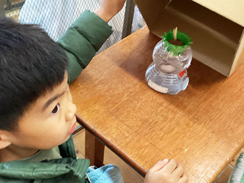 “触らないでね”の看板もみんなで協力して作り、翌日にはさっそく「根は伸びたかな~」と確認する子や、お水が減っていることに気づき、足してあげる姿が。