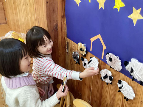 すみれさん。隠れているひつじさん(自分たちが作ったひつじです)を見つけて、イエスさまがお生まれになった馬小屋まで連れてきてあげます。