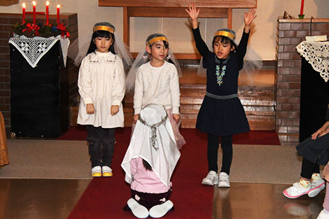 年長児による降誕劇。小さいお友だちに、はじめてのクリスマスのできごとを伝えます。