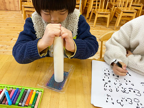 プラスチックカップにクレヨンを塗りつぶし、キッチンペーパーの芯をつけると、丸いスタンプになることを発見しました。スタンプを沢山つけて、色々な動物を描いていきます。指スタンプもして、さらに飾り付け!