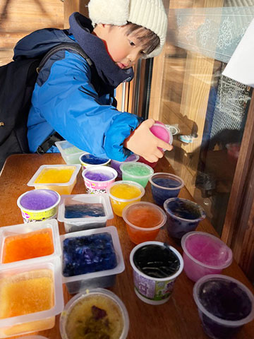 何年かぶりの極寒の朝、前日用意をしておいた色水がどうなっているかな…朝いちばんに来た子が覗いています。