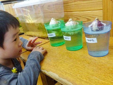 すみれさんでヒヤシンスを育て始めました。今回は3つの球根があり、グループごと育てることになりました。「何色になるかな~?」と予想します。