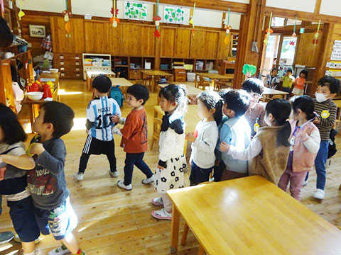 準備が整い、お知らせに行きました。「これから、とん汁パーティーをします。かばんを持って、にじと、もりの部屋に来てください」