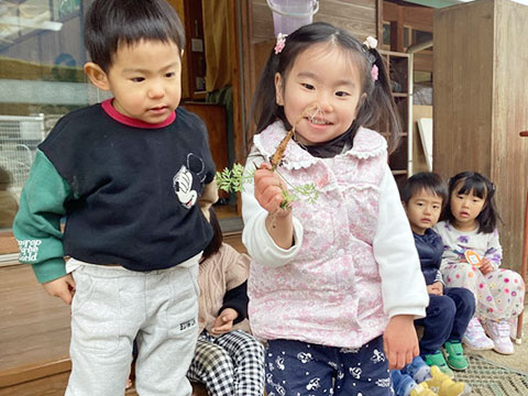 自分たちで育てた人参の、特別なスープ。「おいしいね」「人参見つけたよ」と、大満足な様子のふたばさんでした。