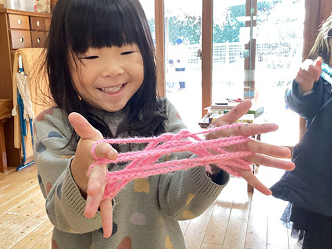 あやとりでは、本を見ながら考えて遊ぶ姿が見られます。指先がよく動き、根気よく取り組んでいます。